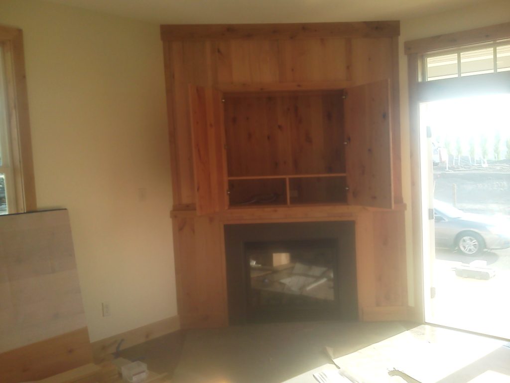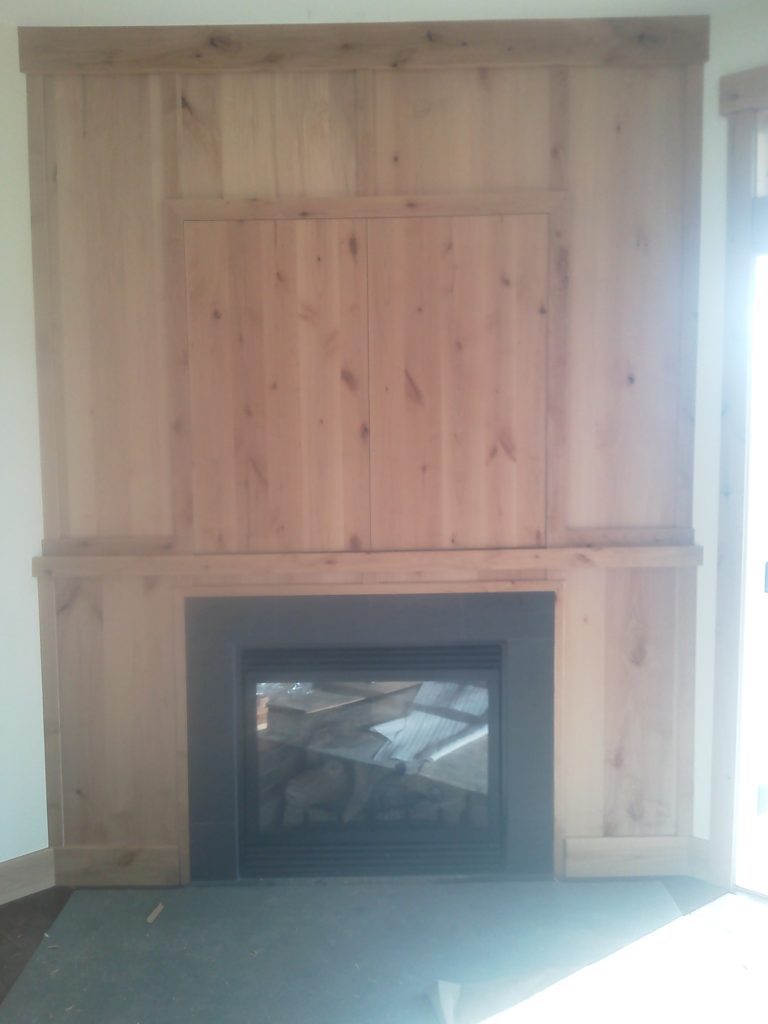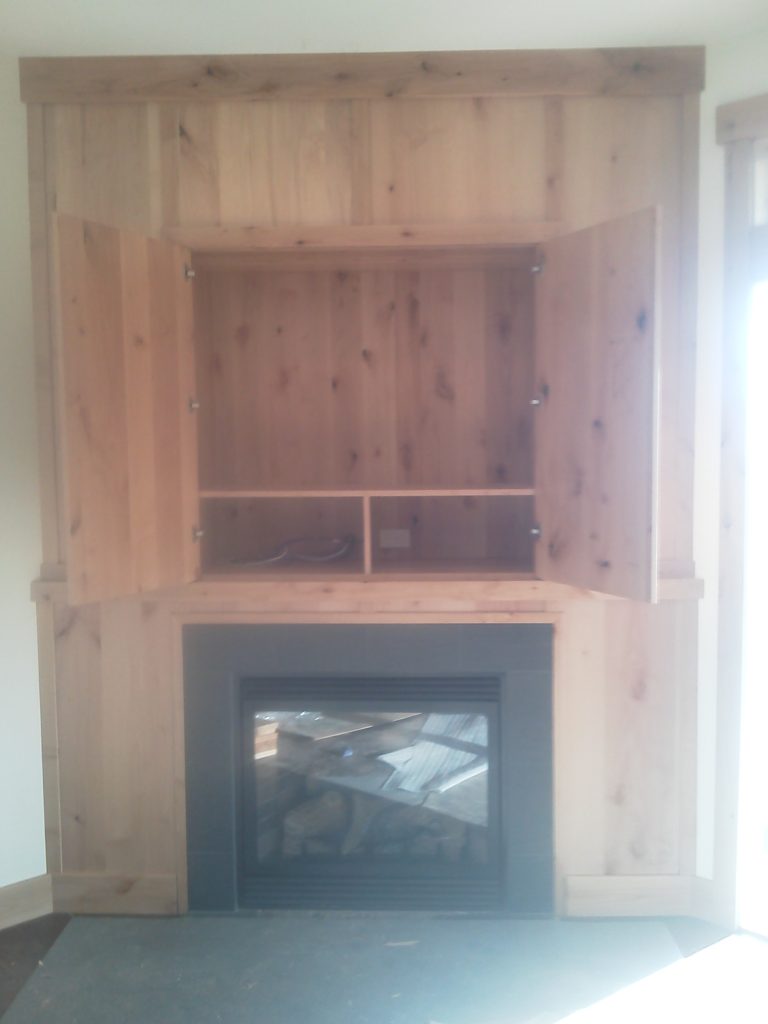 The project featured a modern fireplace surrounded by a warm, cedar wood paneling. We designed and installed a custom cabinet above the fireplace, complete with double doors that open to reveal a spacious storage area with a shelf. This addition not only adds functionality but also complements the natural aesthetic of the wood. The clean lines and sturdy construction ensure the fireplace area is both a focal point and a practical space for your home.
